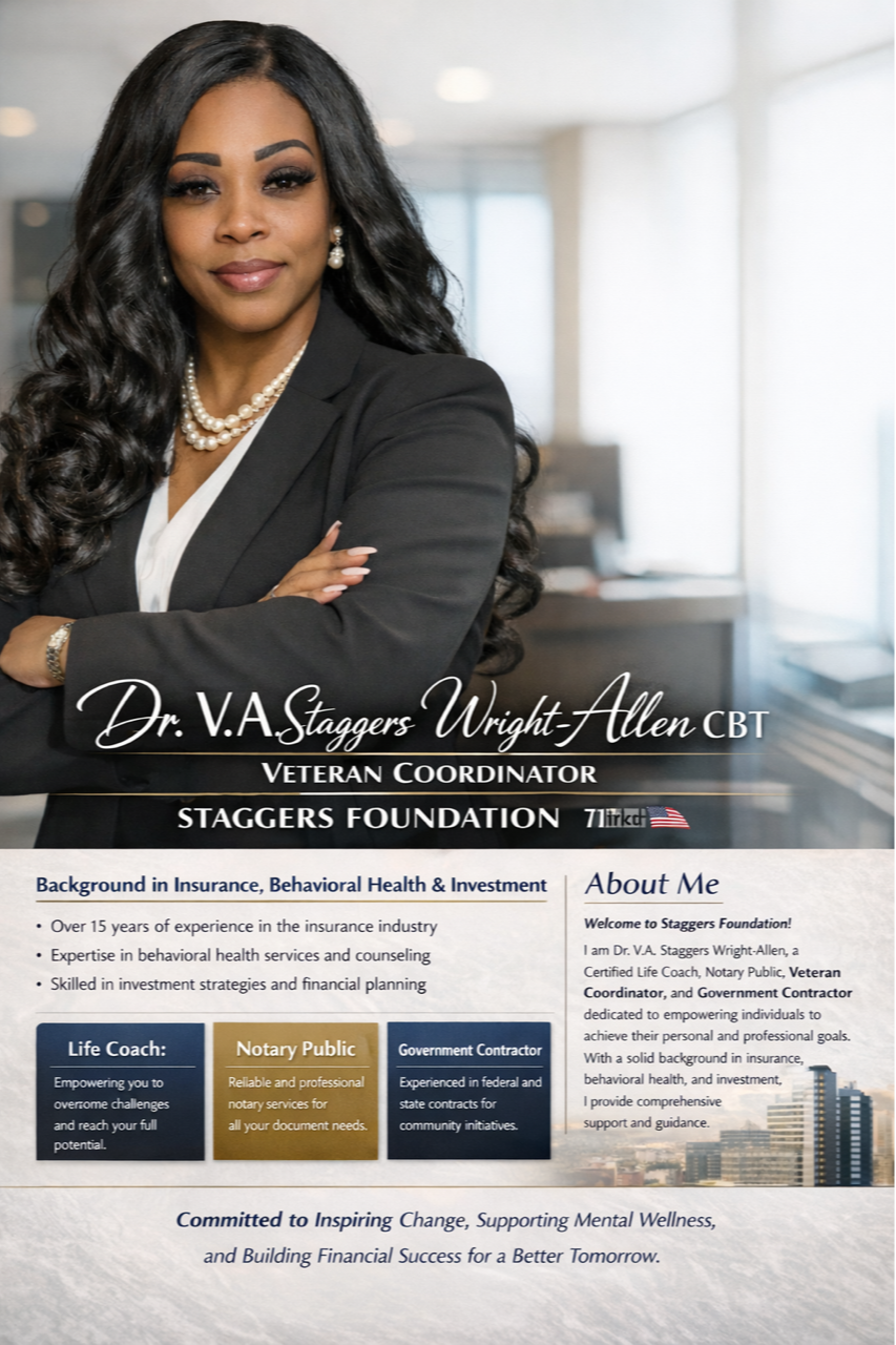 The Staggers Foundation is a community‑driven organization dedicated to restoring safety, dignity, and stability for individuals facing crisis. Through our flagship housing initiative, Dignity Suites, we provide confidential, trauma‑informed transitional housing for U.S. military veterans, domestic‑violence survivors, and individuals rebuilding their lives after instability.
